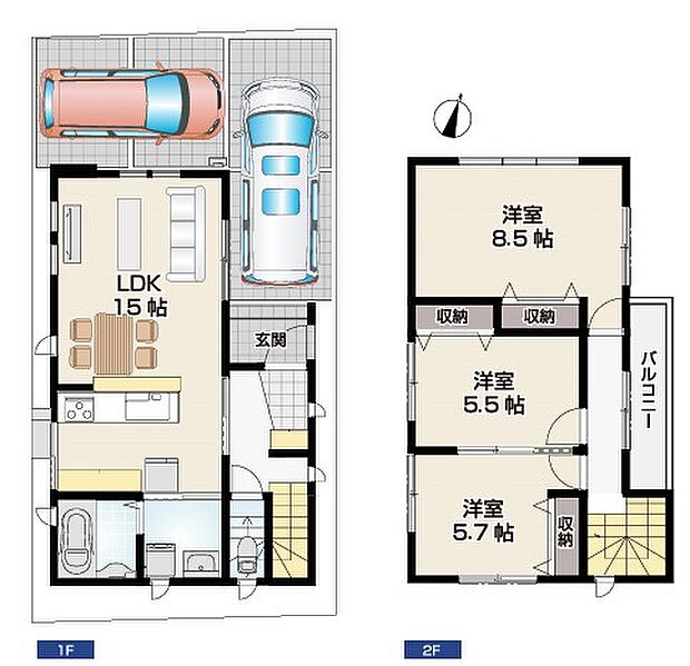 | 間取り | 4LDK 間取り内訳:リビングダイニングキッチン 15帖(1階)・洋室 5.5帖(2階)・洋室 5.7帖(2階)・洋室 8.5帖(2階) |