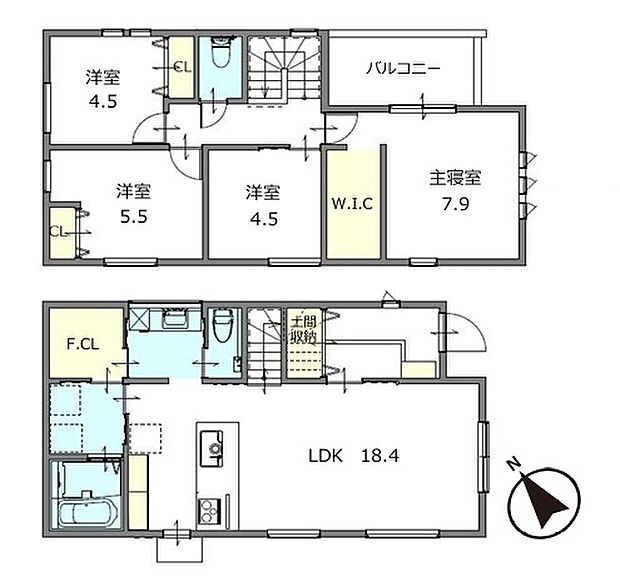 | 間取り | 4LDK 間取り内訳:リビングダイニングキッチン 18.4帖(1階)・洋室 4.5帖(2階)x2・洋室 5.5帖(2階)・洋室 7.9帖(2階) |