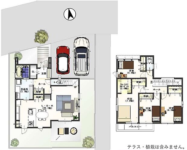 間取り内訳:リビングダイニングキッチン 20帖(1階)・洋室 6帖(2階)・洋室 6.2帖(2階)・洋室 7帖(2階)