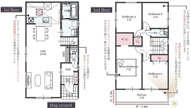 | 間取り | 4LDK 間取り内訳:リビングダイニングキッチン 23帖(1階)・洋室 7.5帖(2階)・洋室 5.5帖(2階)・洋室 5.2帖(2階)・洋室 4.5帖(2階) |