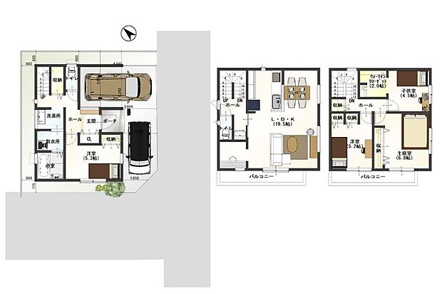| 間取り | 4LDK 間取り内訳:リビングダイニングキッチン 19.5帖(2階)・洋室 5.3帖(1階)・洋室 5.2帖(3階)・洋室 4.5帖(3階)・洋室 6.8帖(3階) |