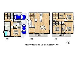 間取り内訳:リビングダイニングキッチン 19.5帖(2階)・洋室 5.3帖(1階)・洋室 5.2帖(3階)・洋室 4.5帖(3階)・洋室 6.8帖(3階)