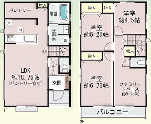 間取り内訳:リビングダイニングキッチン 18.7帖(1階)・洋室 6.7帖(1階)・洋室 5.2帖(2階)・洋室 4.5帖(2階)・その他 5.2帖(2階)