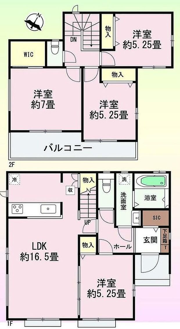 | 間取り | 4LDK 間取り内訳:リビングダイニングキッチン 16.5帖(1階)・洋室 5.2帖(1階)・洋室 5.2帖(2階)x2・洋室 7帖(2階) |