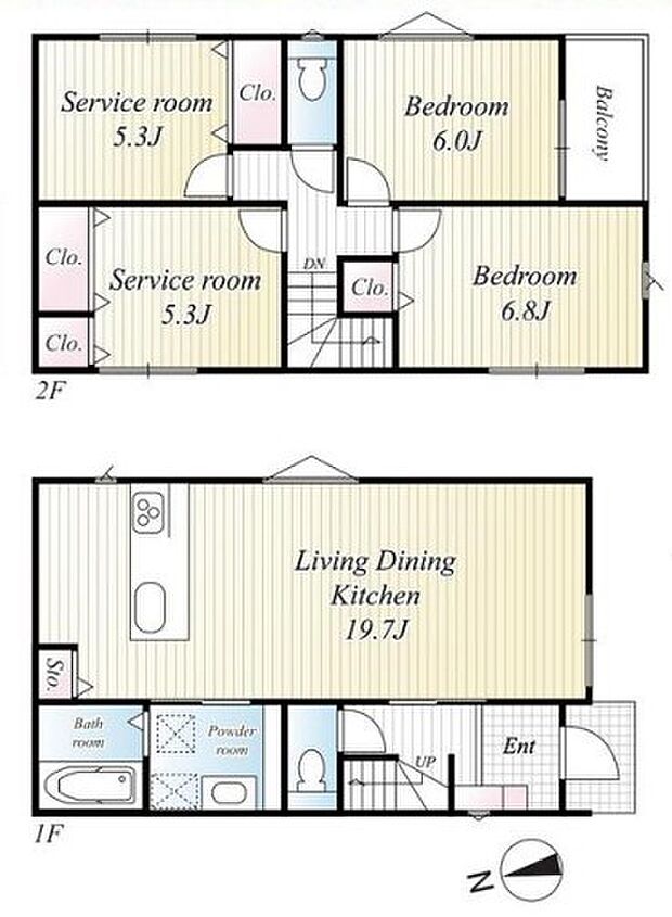 | 間取り | 4LDK 間取り内訳:リビングダイニングキッチン 19.7帖(1階)・洋室 5.3帖(2階)x2・洋室 6帖(2階)・洋室 6.8帖(2階) |