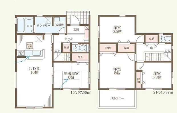| 間取り | 4LDK 間取り内訳:洋室 6帖(1階)・リビングダイニングキッチン 16帖(1階)・洋室 5.3帖(2階)・洋室 6.5帖(2階)・洋室 8帖(2階) |