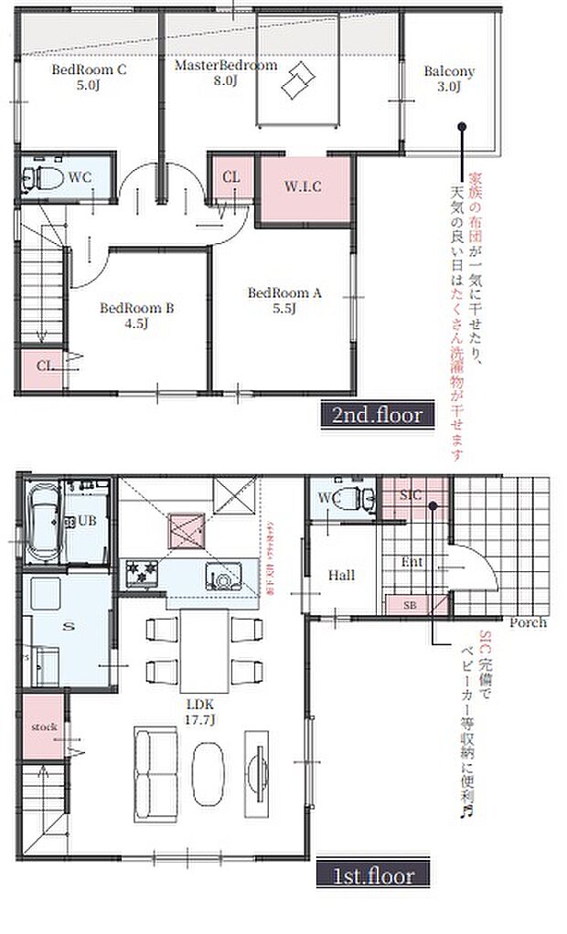 | 間取り | 4LDK 間取り内訳:リビングダイニングキッチン 17.7帖(1階)・洋室 5帖(2階)・洋室 8帖(2階)・洋室 4.5帖(2階)・洋室 5.5帖(2階) |