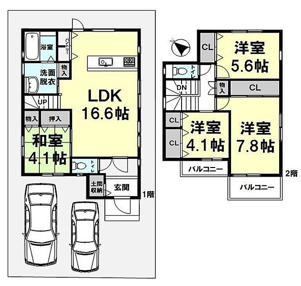 | 間取り | 4LDK 間取り内訳:リビングダイニングキッチン 16.6帖(1階)・和室 4.1畳(1階)・洋室 7.8帖(2階)・洋室 5.6帖(2階)・洋室 4.1帖(2階) |