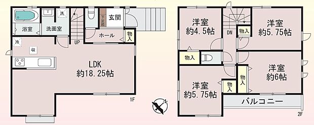 | 間取り | 4LDK 間取り内訳:リビングダイニングキッチン 18.2帖(1階)・洋室 4.5帖(2階)・洋室 5.7帖(2階)x2・洋室 6帖(2階) |