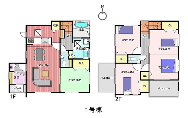 | 間取り | 4LDK 間取り内訳:リビングダイニングキッチン 16帖(1階)・和室 5.2畳(1階)・洋室 5.2帖(2階)・洋室 5.4帖(2階)・洋室 10.5帖(2階) |