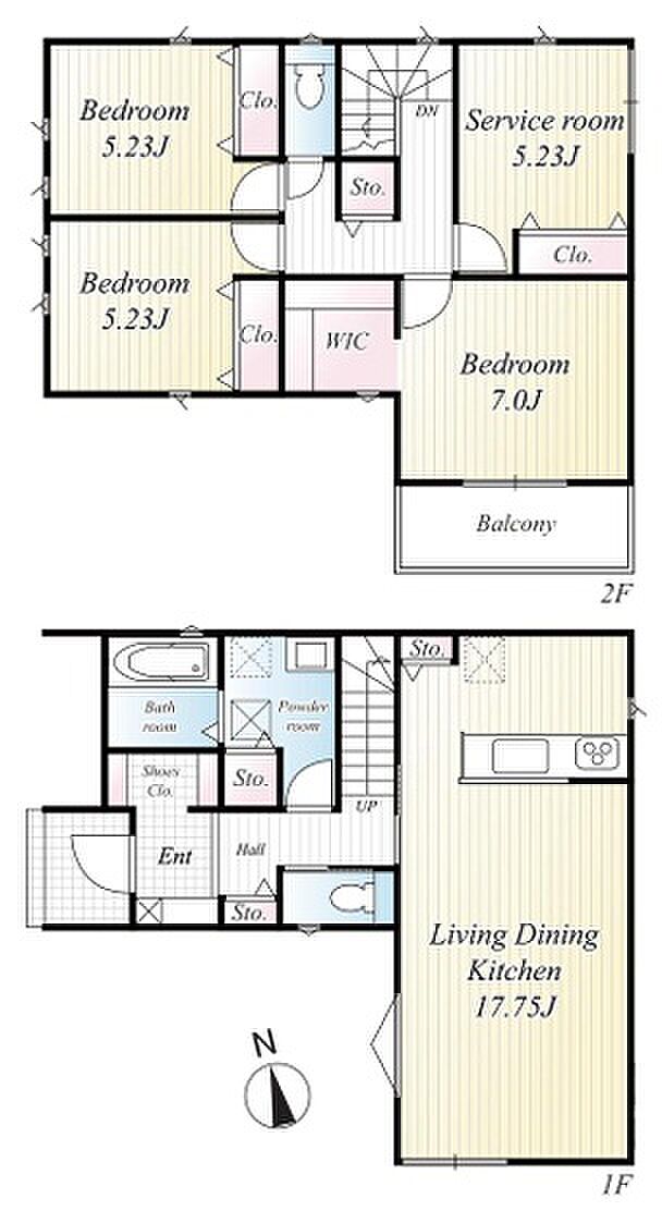 | 間取り | 4LDK 間取り内訳:リビングダイニングキッチン 17.7帖(1階)・和室 5.2畳(2階)x3・洋室 7帖(2階) |