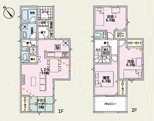 | 間取り | 3LDK 間取り内訳:リビングダイニングキッチン 16帖(1階)・和室 3畳(1階)・洋室 6.5帖(2階)x3 |