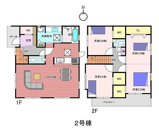 | 間取り | 3LDK 間取り内訳:リビングダイニングキッチン 20帖(1階)・洋室 5.2帖(2階)・洋室 6.2帖(2階)・洋室 10.5帖(2階) |