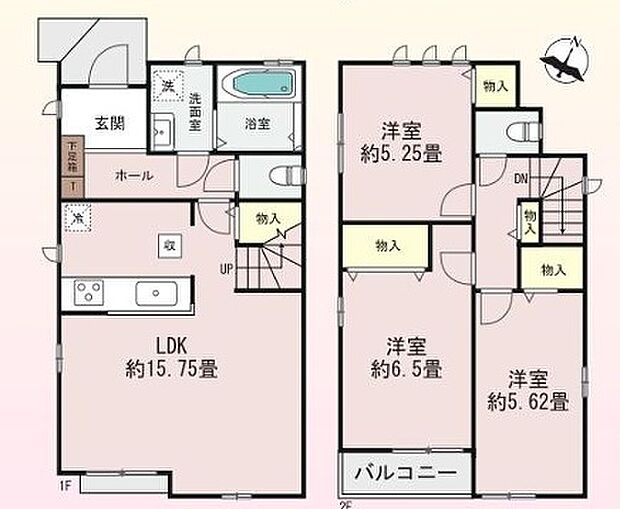 | 間取り | 3LDK 間取り内訳:リビングダイニングキッチン 15.7帖(1階)・洋室 5.2帖(2階)・洋室 5.6帖(2階)・洋室 6.5帖(2階) |