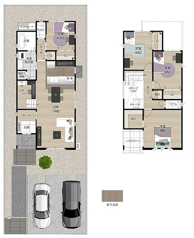 | 間取り | 4LDK 間取り内訳:リビングダイニングキッチン 19帖(1階)・洋室 4.5帖(1階)・洋室 8帖(2階)・洋室 6帖(2階)x2 |