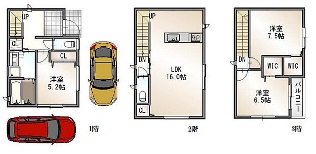 | 間取り | 3LDK 間取り内訳:洋室 5.2帖(1階)・リビングダイニングキッチン 16帖(2階)・洋室 6.5帖(2階)・洋室 7.5帖(2階) |