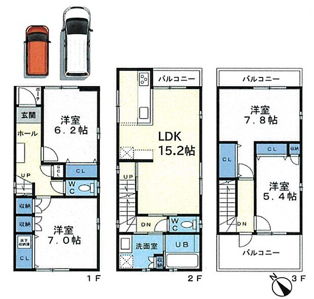 | 間取り | 4LDK 間取り内訳:洋室 7帖(1階)・リビングダイニングキッチン 15.2帖(2階)・洋室 6.2帖(1階)・洋室 7.8帖(3階)・洋室 5.4帖(3階) |