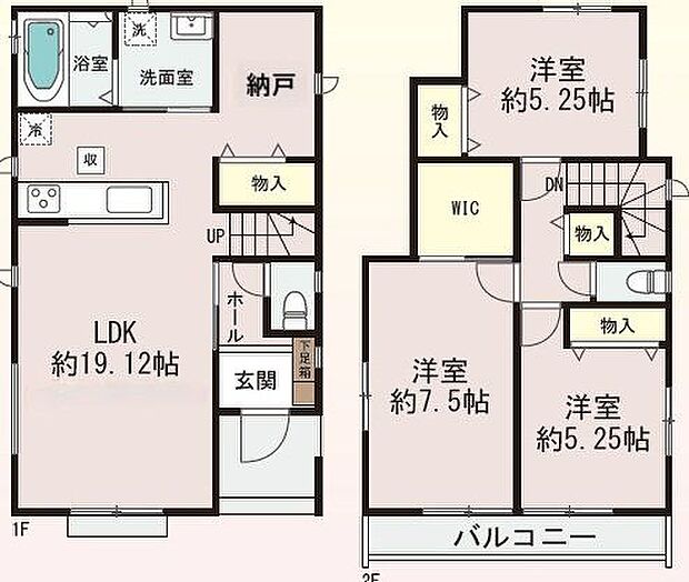 | 間取り | 3SLDK 間取り内訳:リビングダイニングキッチン(1階)・収納(1階)・洋室 5.2帖(2階)・洋室 5.2帖(2階)・洋室 7.5帖(2階) |