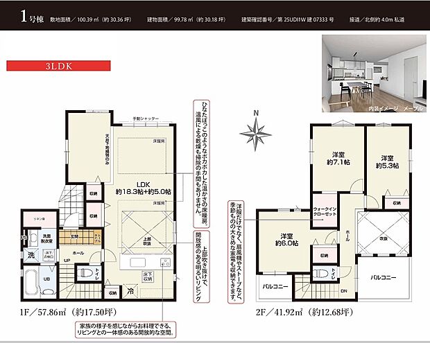 間取り内訳:リビングダイニングキッチン 23.3帖(1階)・洋室 5.3帖(2階)・洋室 6帖(2階)・洋室 7.1帖(2階)