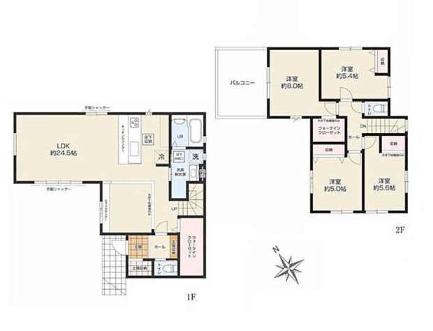 | 間取り | 4LDK 間取り内訳:リビングダイニングキッチン 24.5帖(1階)・洋室 8帖(2階)・洋室 5.4帖(2階)・洋室 5.6帖(2階)・洋室 5帖(2階) |