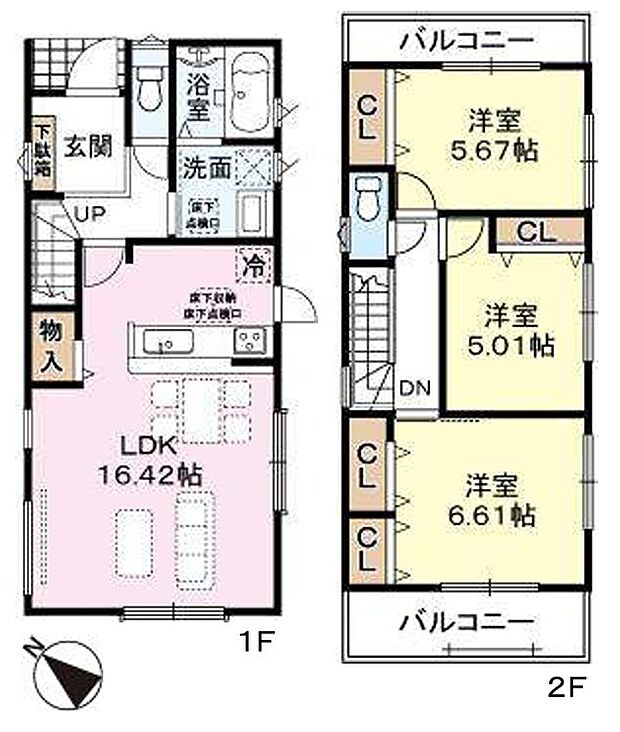 | 間取り | 3LDK 間取り内訳:リビングダイニングキッチン 16.4帖(1階)・洋室 5.6帖(2階)・洋室 5帖(2階)・洋室 6.6帖(2階) |