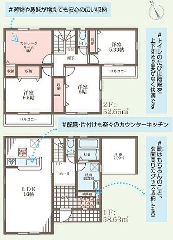 | 間取り | 4LDK 間取り内訳:リビングダイニングキッチン 16帖(1階)・洋室 5.3帖(2階)・洋室 6帖(2階)x2・洋室 6.5帖(2階) |