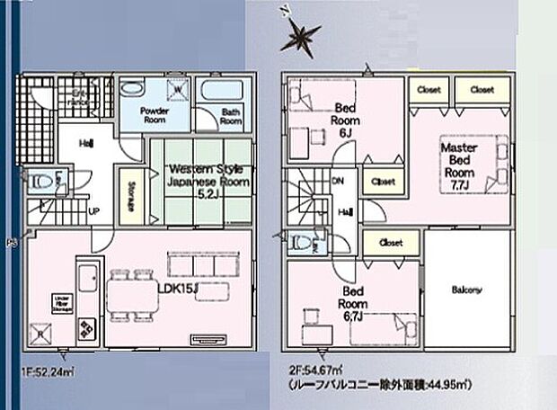 間取り内訳:リビングダイニングキッチン 15帖(1階)・和室 5.2畳(1階)・洋室 6帖(2階)・洋室 6.7帖(2階)・洋室 7.7帖(2階)