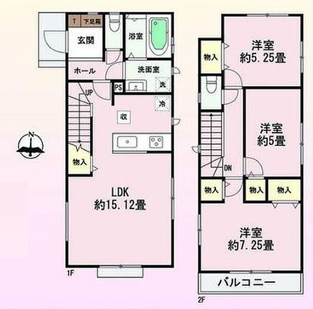 | 間取り | 3LDK 間取り内訳:リビングダイニングキッチン 15.1帖(1階)・洋室 5帖(2階)・洋室 5.2帖(2階)x2・洋室 7.2帖(2階) |
