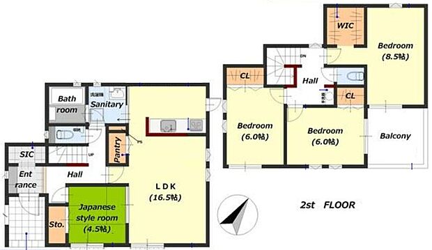 間取り内訳:リビングダイニングキッチン 16.5帖(1階)・和室 4.5畳(1階)・洋室 6帖(2階)x2・洋室 8.5帖(2階)