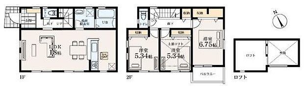 | 間取り | 3LDK 間取り内訳:リビングダイニングキッチン 18帖(1階)・洋室 5.3帖(2階)・洋室 5.3帖(2階)・洋室 6.7帖(2階) |