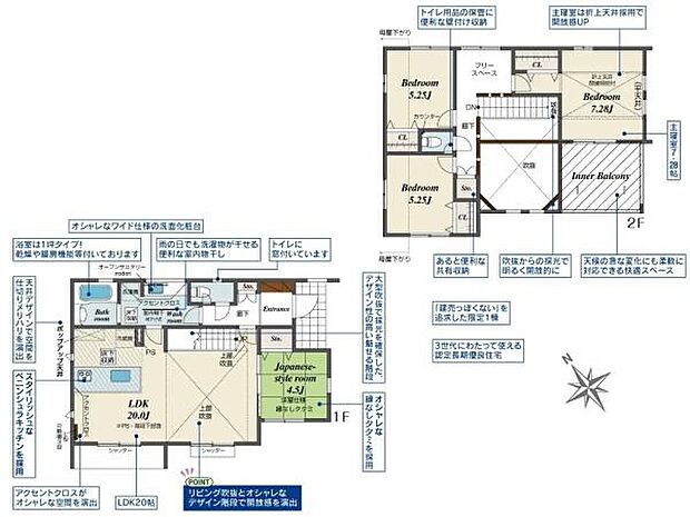 | 間取り | 4LDK 間取り内訳:リビングダイニングキッチン 20帖(1階)・和室 4.5畳(2階)・洋室 5.2帖(2階)・洋室 5.2帖(2階)・洋室 7.2帖(2階) |