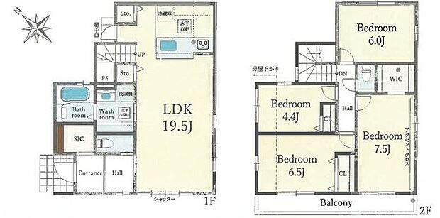 | 間取り | 4LDK 間取り内訳:洋室 6帖(2階)・洋室 7.5帖(2階)・洋室 6.5帖(2階)・リビングダイニングキッチン 19.5帖(1階)・洋室 4.4帖(2階) |