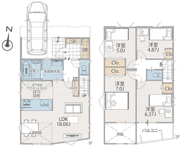 | 間取り | 4LDK 間取り内訳:リビングダイニングキッチン 18帖(1階)・洋室 7帖(2階)・洋室 6.3帖(2階)・洋室 5帖(2階)・洋室 4.8帖(2階) |