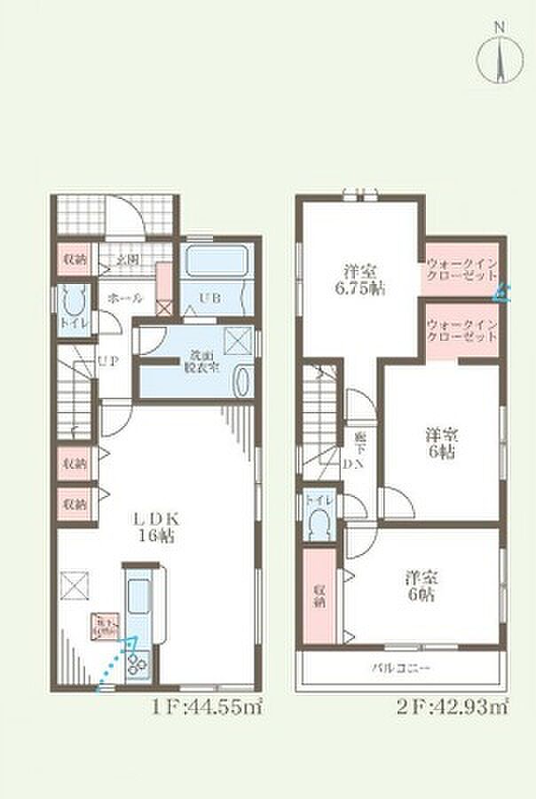 間取り内訳:リビングダイニングキッチン 16帖(1階)・洋室 6.7帖(2階)x2・洋室 6帖(2階)