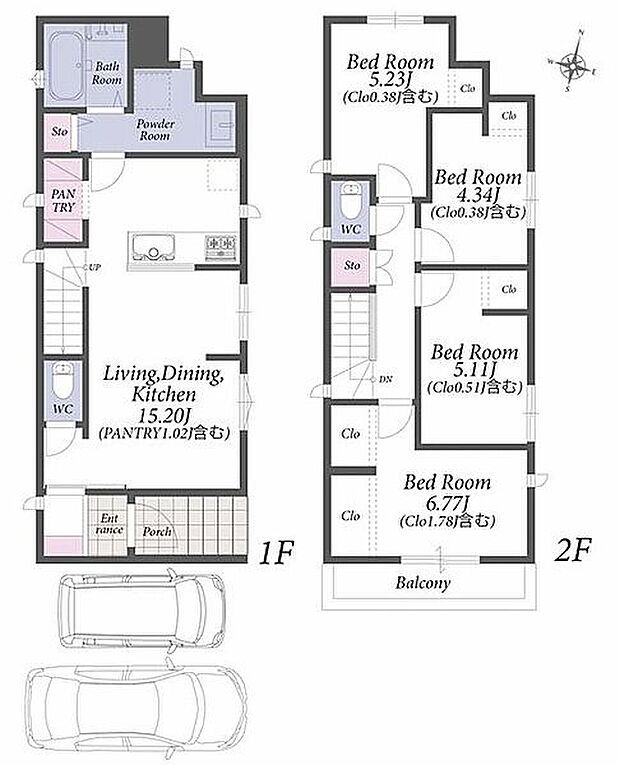 パントリー付。LDKには対面式キッチン採用。並列駐車2台可能な新邸です。