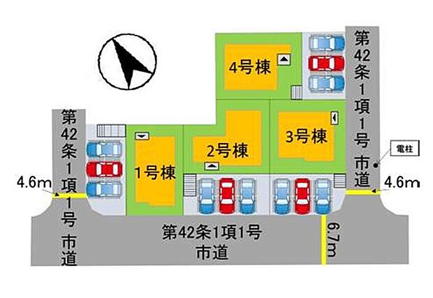 1号棟:南6.7m 西4.6m /4号棟:東4.6m /2号棟:南6.7m /3号棟:東4.6m