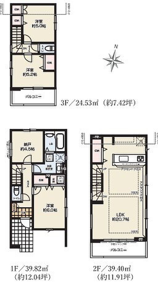 | 間取り | 3LDK 間取り内訳:リビングダイニングキッチン 20.7帖・洋室 6帖・洋室 5.2帖・洋室 5帖・収納 4.5帖 |