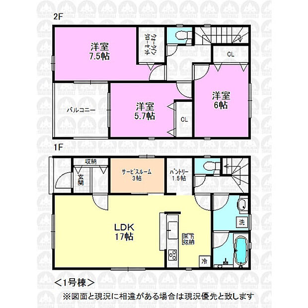 LDK約17帖/対面キッチンで開放感/主寝室7.5帖と大きな寝具も設置可能/カースペース2台(車種による)