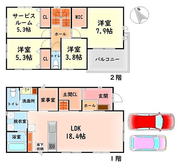 | 間取り | 4LDK 間取り内訳:リビングダイニングキッチン 18.4帖(1階)・洋室 7.9帖(2階)・収納 5.3帖(2階)・洋室 5.3帖(2階)・洋室 3.8帖(2階) |