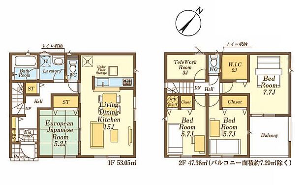 | 間取り | 4LDK 間取り内訳:洋室 7.7帖(2階)・洋室 5.7帖(2階)・洋室 5.7帖(2階)・和室 5.2畳(1階)・リビングダイニングキッチン 15帖(1階) |