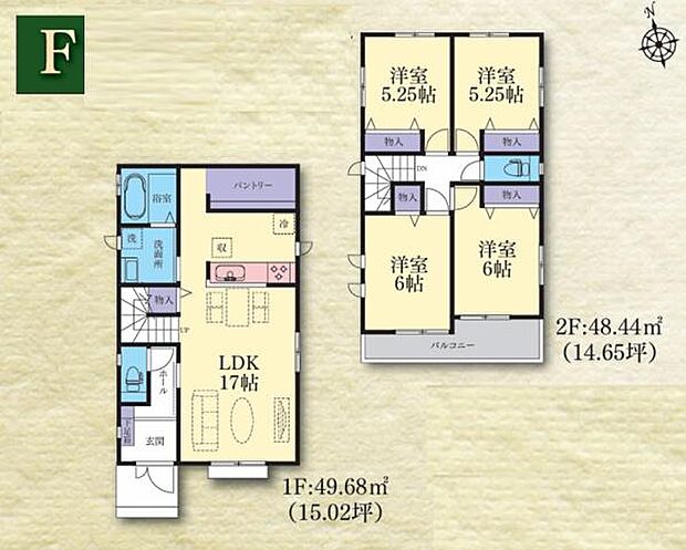 | 間取り | 4LDK 間取り内訳:リビングダイニングキッチン 17帖(1階)・洋室 6帖(2階)・洋室 6帖(2階)・洋室 5.2帖(2階)・洋室 5.2帖(2階) |