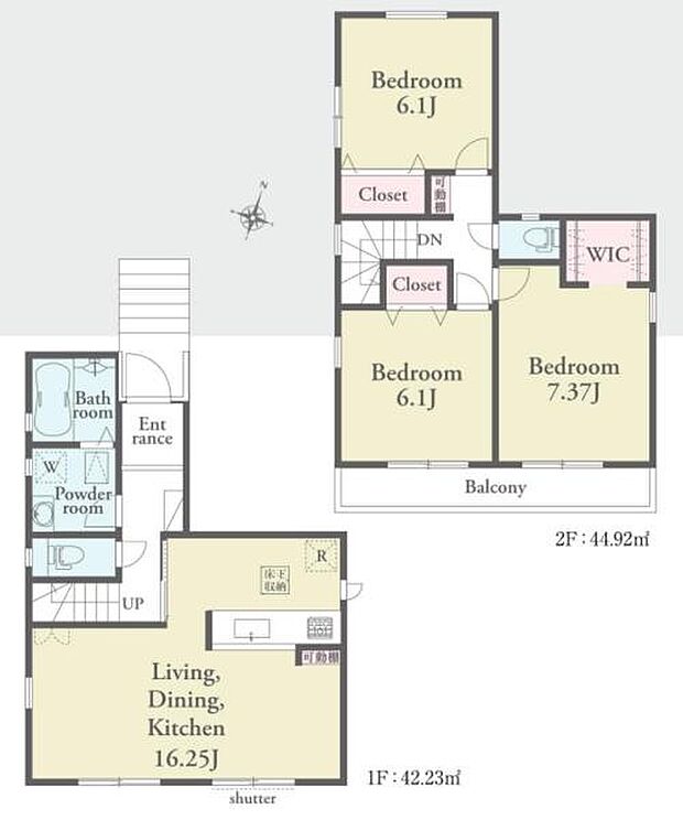 間取り内訳:リビングダイニングキッチン 16.2帖(1階)・洋室 7.3帖(2階)・洋室 6.1帖(2階)・洋室 6.1帖(2階)