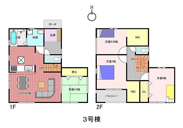 | 間取り | 4LDK 間取り内訳:リビングダイニングキッチン 16.5帖(1階)・和室 4.5畳(1階)・洋室 5.2帖(2階)・洋室 6帖(2階)・洋室 7帖(2階) |