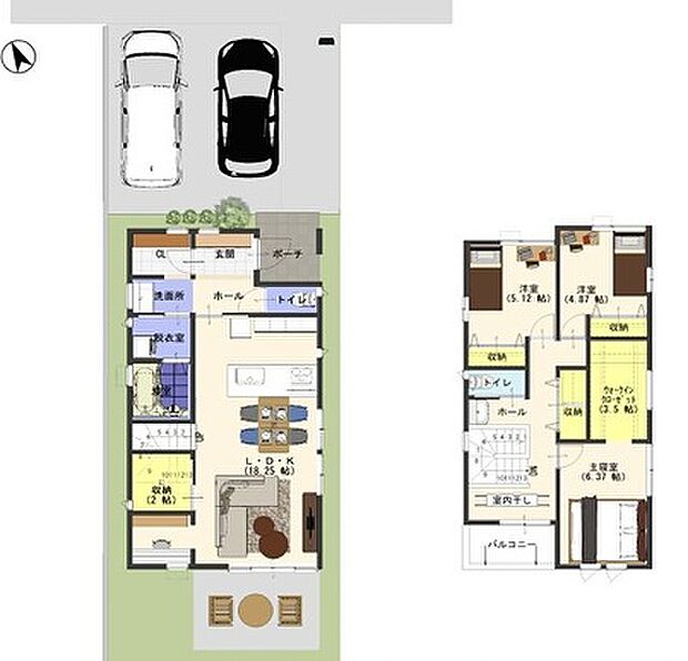 | 間取り | 3LDK 間取り内訳:リビングダイニングキッチン 18.2帖(1階)・洋室 4.8帖(1階)・洋室 5.1帖(2階)・洋室 6.3帖(2階) |