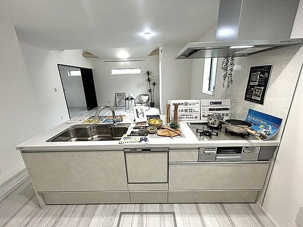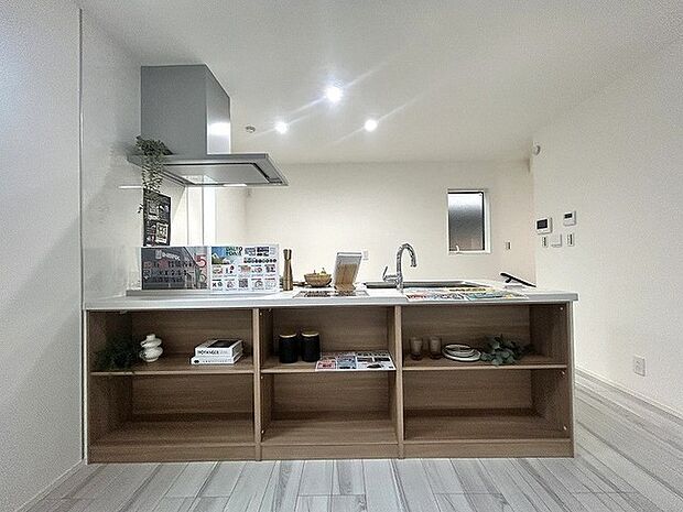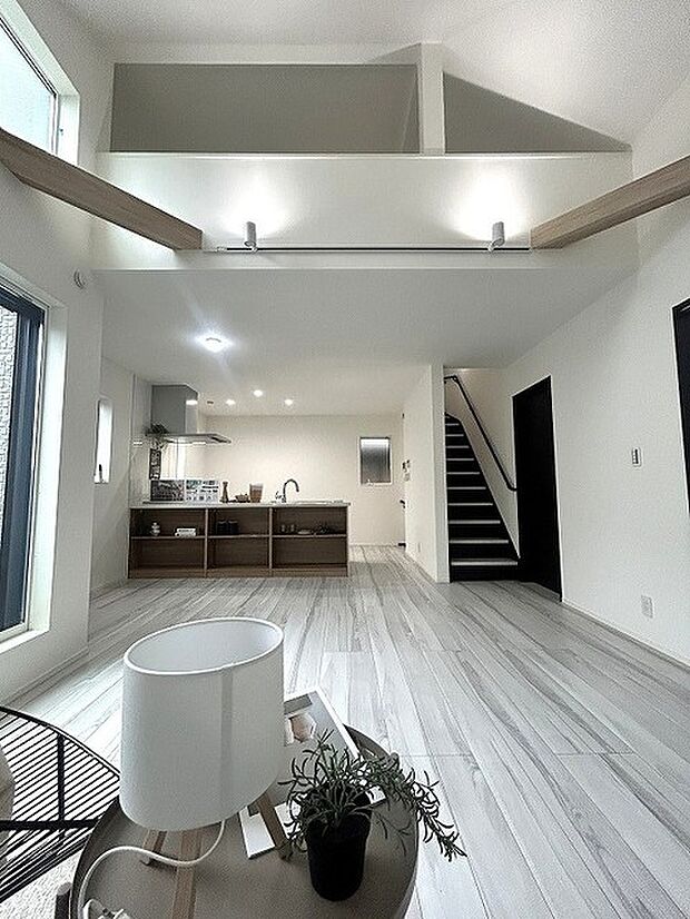 免振スーパージオ工法の家、カウンターキッチンと勾配天井のある開放的な空間設計。断熱等級5、一次エネルギー消費等級6取得。生活施設の整った住環境、周辺は閑静な住宅地です。