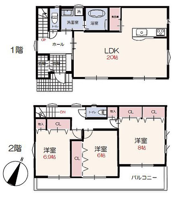 | 間取り | 3LDK 間取り内訳:洋室 8帖(2階)・洋室 6.9帖(2階)・洋室 6帖(2階)・リビングダイニングキッチン 20帖(1階) |