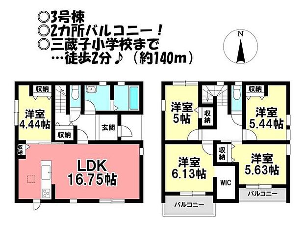 三蔵子小学校・金屋中学校。三蔵子小学校まで徒歩2分(約140m)※資料請求・見学予約は下部の「見学予約する」「資料請求・お問合せ」よりお気軽にお問い合わせください!