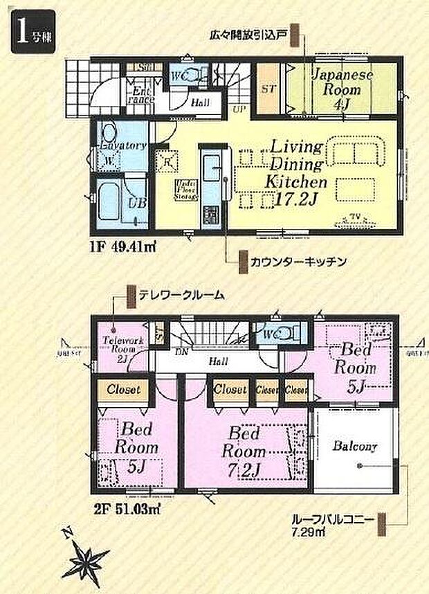 間取り内訳:リビングダイニングキッチン 17.2帖(1階)・和室 4畳(1階)・洋室 5帖(2階)・洋室 5帖(2階)・洋室 7.2帖(2階)
