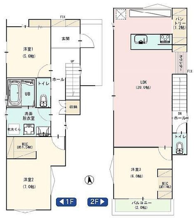 | 間取り | 3LDK 間取り内訳:洋室 5.6帖(1階)・洋室 7帖(1階)・リビングダイニングキッチン 20帖(2階)・洋室 6帖(2階) |