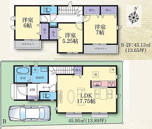 | 間取り | 3LDK 間取り内訳:リビングダイニングキッチン 17.7帖(1階)・洋室 7帖(2階)・洋室 6帖(2階)・洋室 5.2帖(2階) |